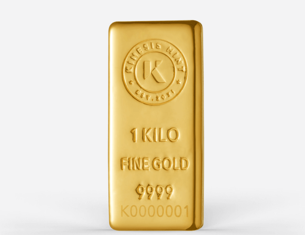 The 1kg gold cast bar is printed with the Kinesis Mint stamp and unique serial number. Investment-grade gold bullion, with a fineness of 9999