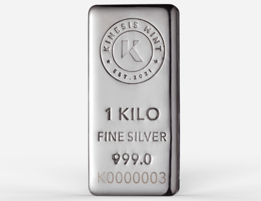 The 1kg silver cast bar is printed with the Kinesis Mint stamp and unique serial number. Investment-grade silver bullion, with a fineness of 999.0
