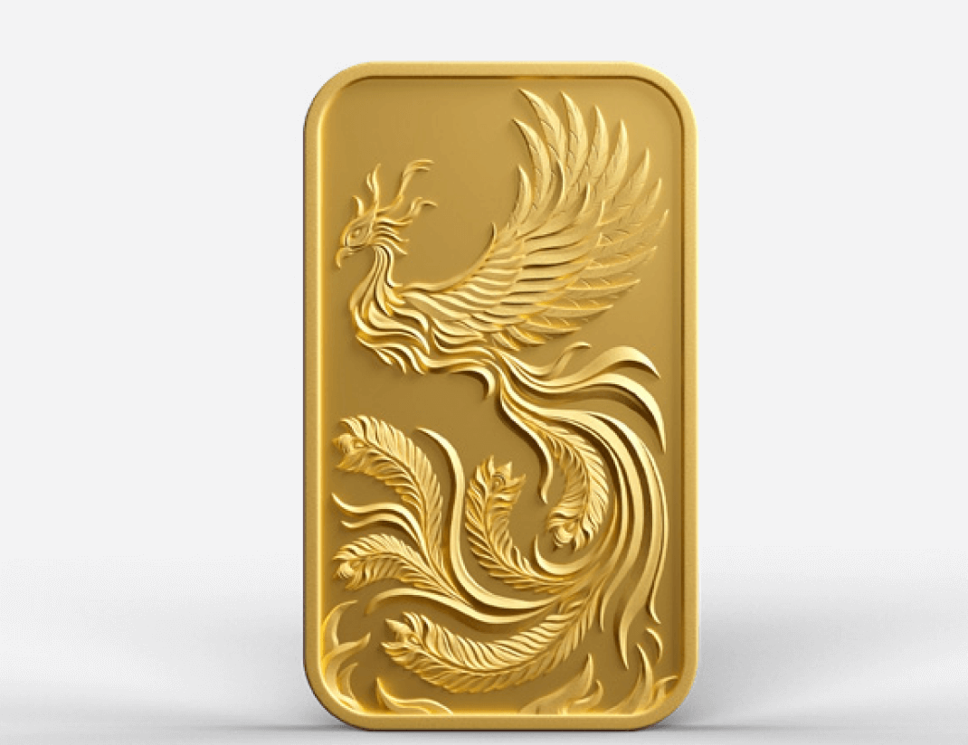 The gold bar represents the rebirth of a monetary system, backed by the enduring value of precious metals On the reverse is the signature stamp of the Kinesis Mint. The 100g Phoenix bar 2023 is 9999 fine gold.