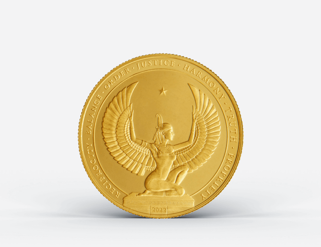 This bespoke gold coin featuring the Egyptian goddess of justice, Ma’at, aligns with the principles in which Kinesis believes monetary systems should operate. Investment-grade gold bullion, with a fineness of 9999