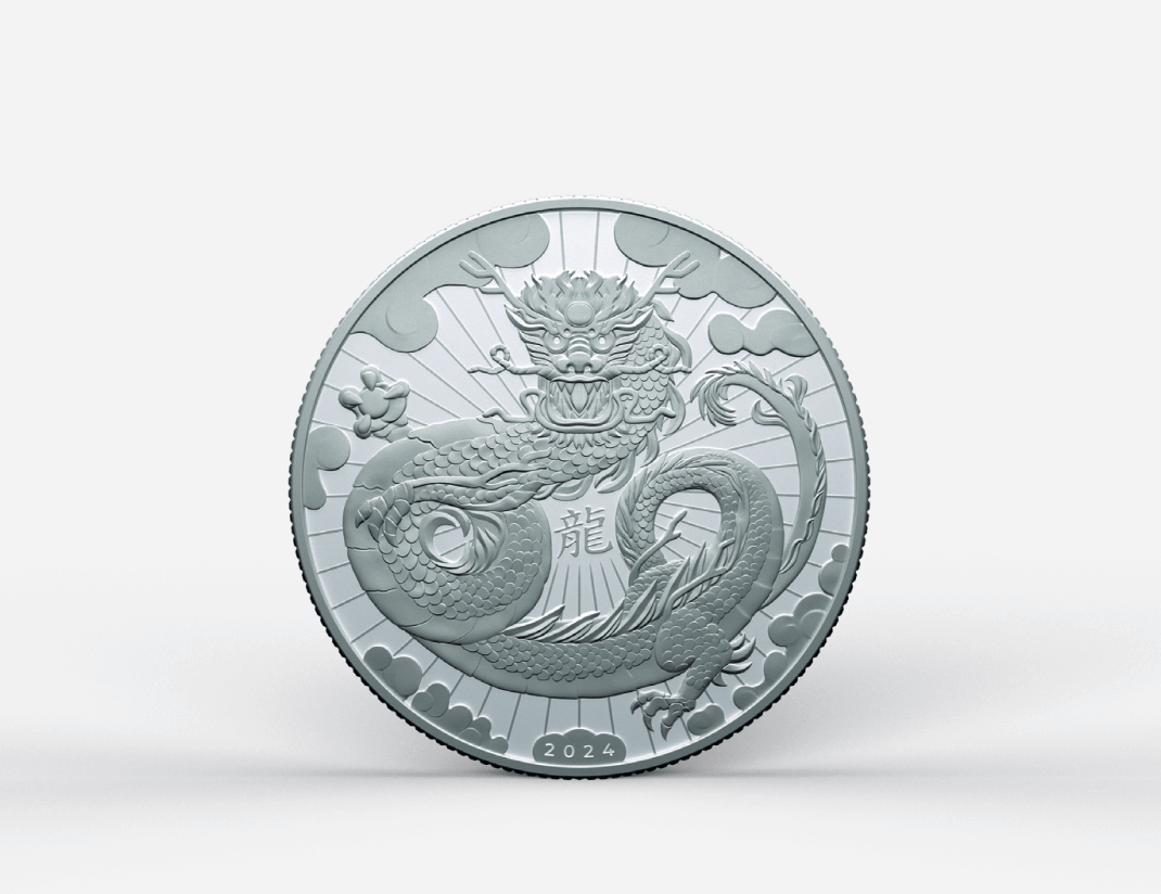 The silver coin celebrates Chinese New Year and has a minimum fineness of 999. On the reverse is Kinesis’ new checkerboard design. The 1oz Kinesis Silver Lunar Dragon coin is 999 fine silver.